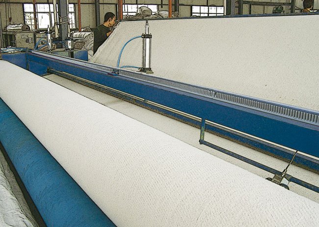 土工织物的制造过程是首先把聚合物原料加工成丝、短纤维、纱或条带,然